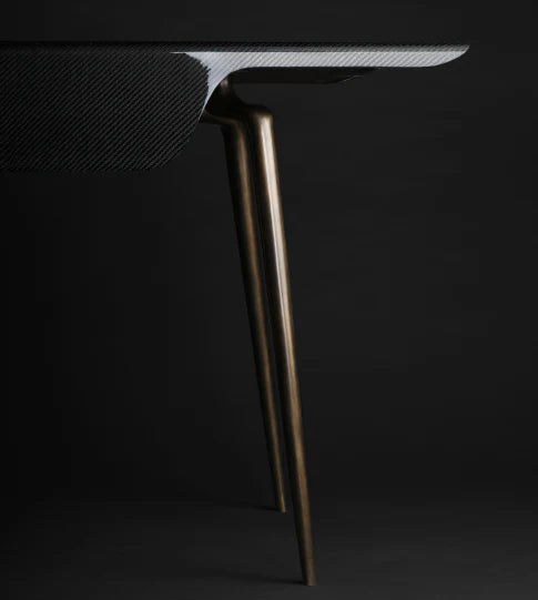 Designed to create a statement, the collection is crafted with Madheke’s attention to detail. The Talon desk features a lightweight carbon fibre top, hovering over cast brass legs that taper to a point. An inset soft leather blotter offers a working surface, and a discreet slimline drawer of a matte-finished walnut is incorporated to store stationery.