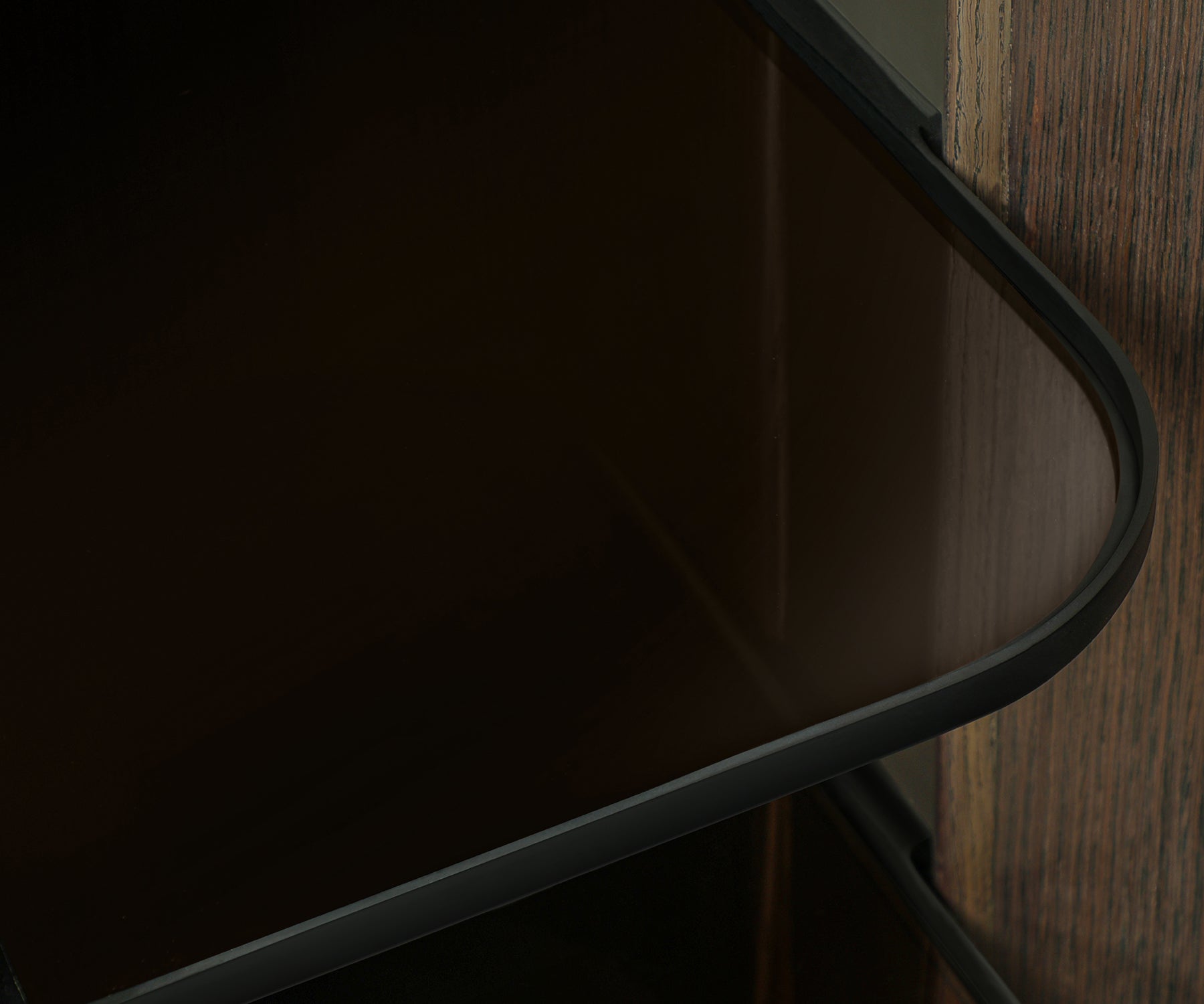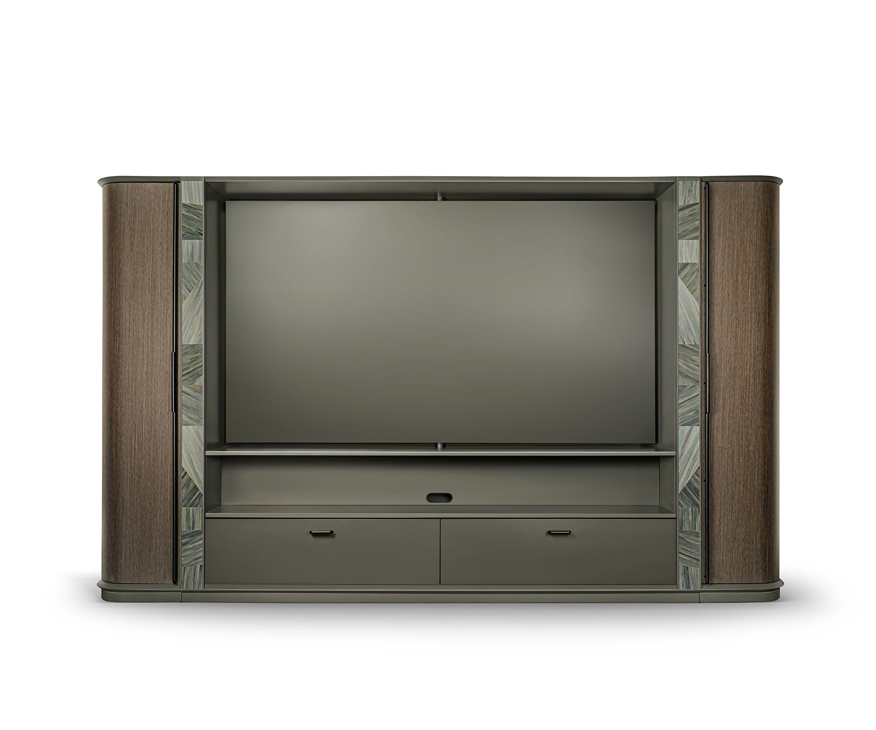 - Freestanding media island with integrated swivel screen for flexible viewing.